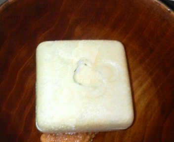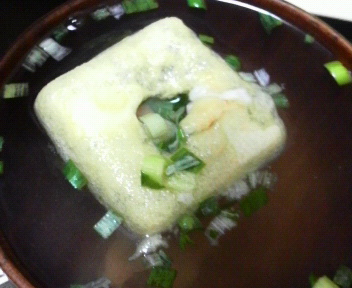 おふのお味噌汁で、もなかの真ん中を指であけて、お湯を注ぐと